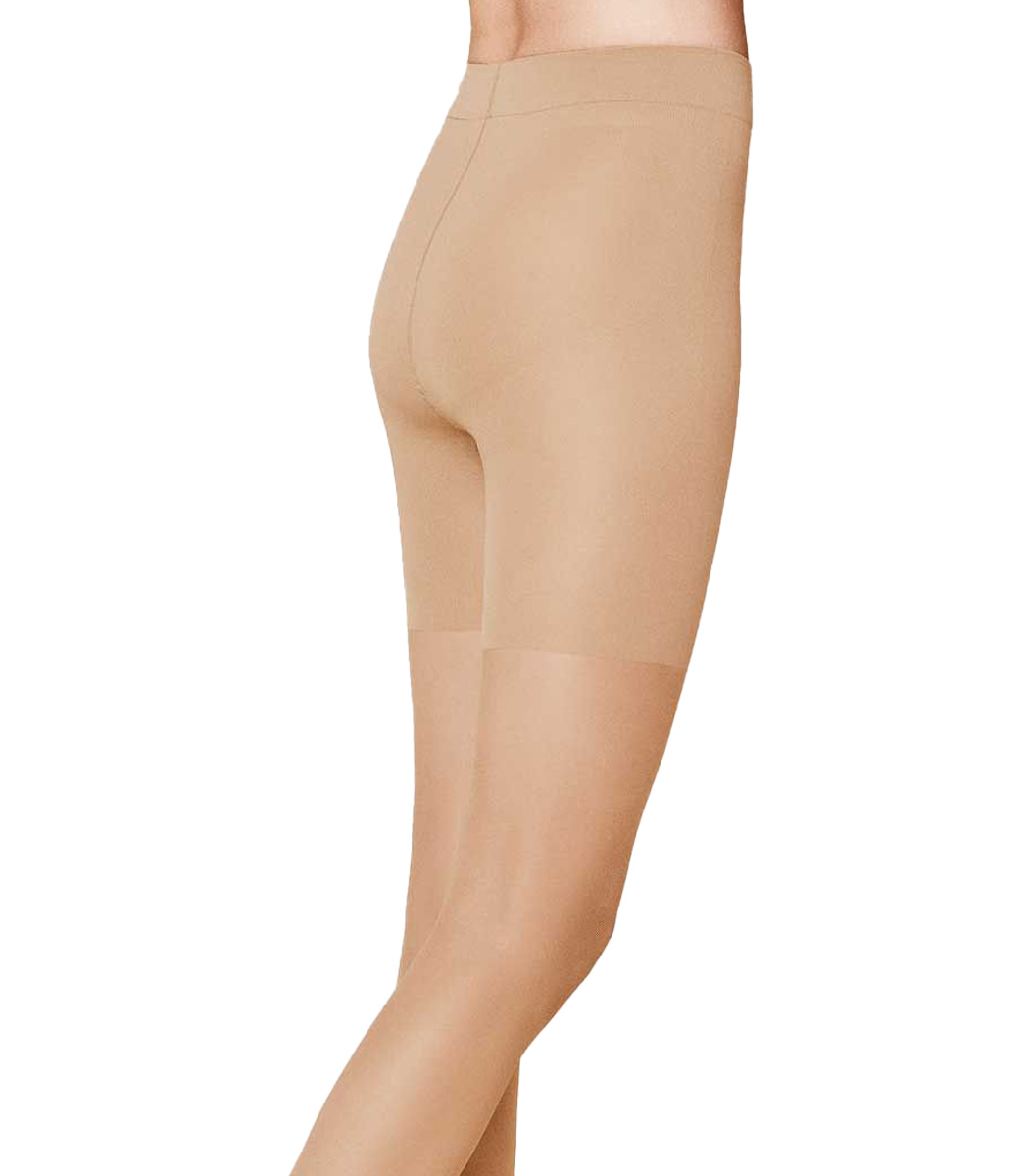 - 20 DEN transparent: Das hauchzarte Beinteil zeigt deine natürliche Hautfarbe mit einem seidigen Schimmer. Die Transparenz steht in bewusstem Kontrast zum formenden Höschenteil: Oben wird geformt, die Beine werden geschmeichelt – alles in einer Strumpfhose.