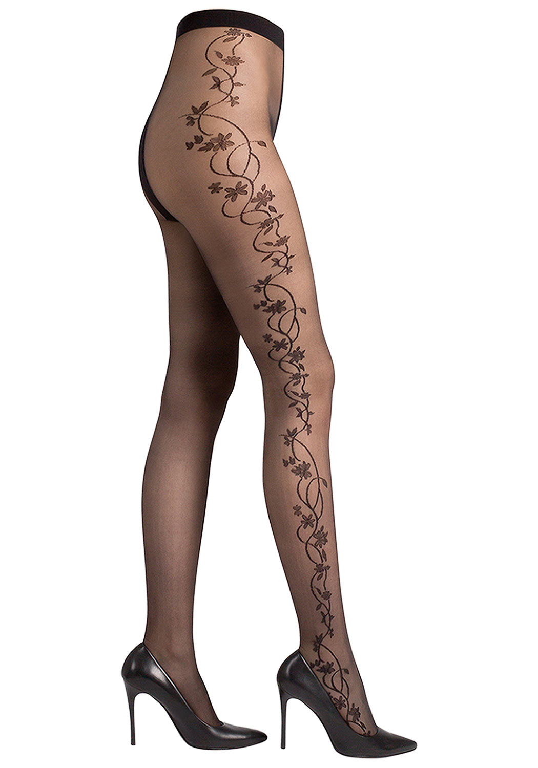 These FLORA 20 DEN patterned tights will surprise you with their spectacular floral design, ideal for lovers of detail, making them a must-have in every woman's wardrobe. The floral pattern creates a decorative pattern on the sides of the legs, visually lengthening them. The floral tights are a great addition to both casual and formal outfits. The unreinforced panty section with flat seams and cotton gusset guarantee all-day comfort. Thanks to the invisible reinforcement in the toe area, the thin tights can be combined with any footwear.